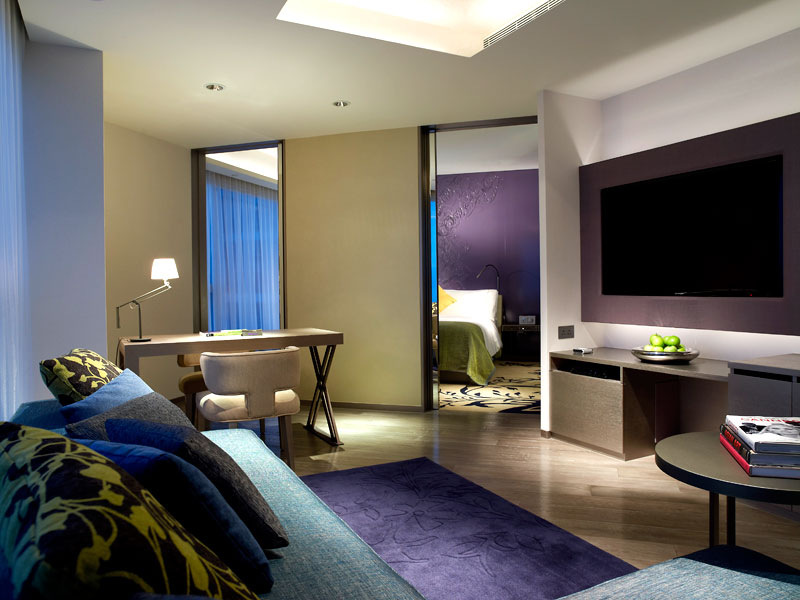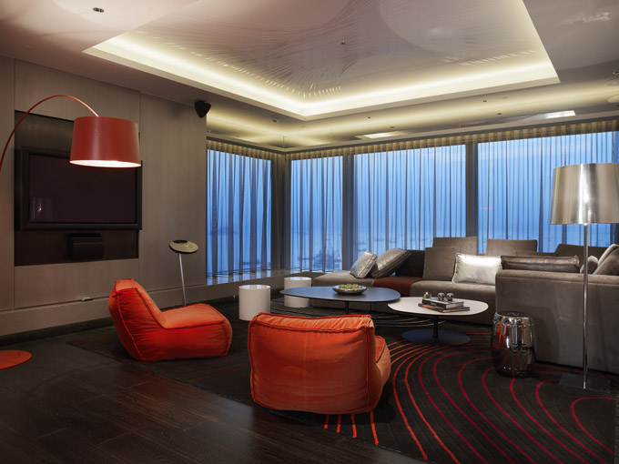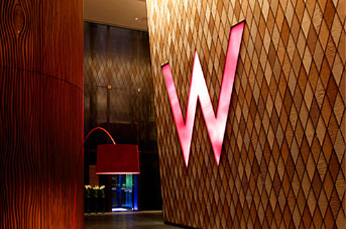 Derrière une façade de verre, le W dévoile 393 chambres dont 42 suites. Décorés par la société Australienne g+a (nicholas graham + associates) et par la société Glamorous, les étages surprennent par leurs couleurs, leur pureté et l’utilisation de l’espace.