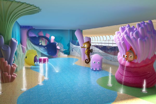 Nemo’s Reef, une zone aquatique pour jeunes enfants, affiche les personnages du film Nemo. Un toboggan aquatique ressemble à M. Raie et Perle, la pieuvre, « s’encre » avec de la brume d’eau.